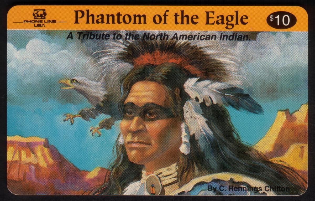 The background is rich with artistic elements, using warm colors such as gold and amber tones, enhancing the cultural tribute aspect of the artwork. Along the top edge of the card, the title "Phantom Of The Eagle (Tribute To The North American Indian)" is printed in a clean, white font. The card also includes the logo "PhoneLine USA" in the upper right corner, indicating the phone card issuer.