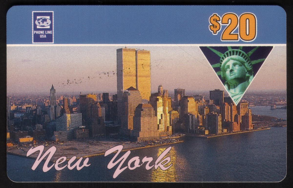 The top section of the card includes a blue banner with the white "Phone Line USA" logo on the left and the denomination "$20" in bold orange on the right. The card embodies American historical landmarks and Americana, highlighting two iconic national monuments of New York: the World Trade Center and the Statue of Liberty.