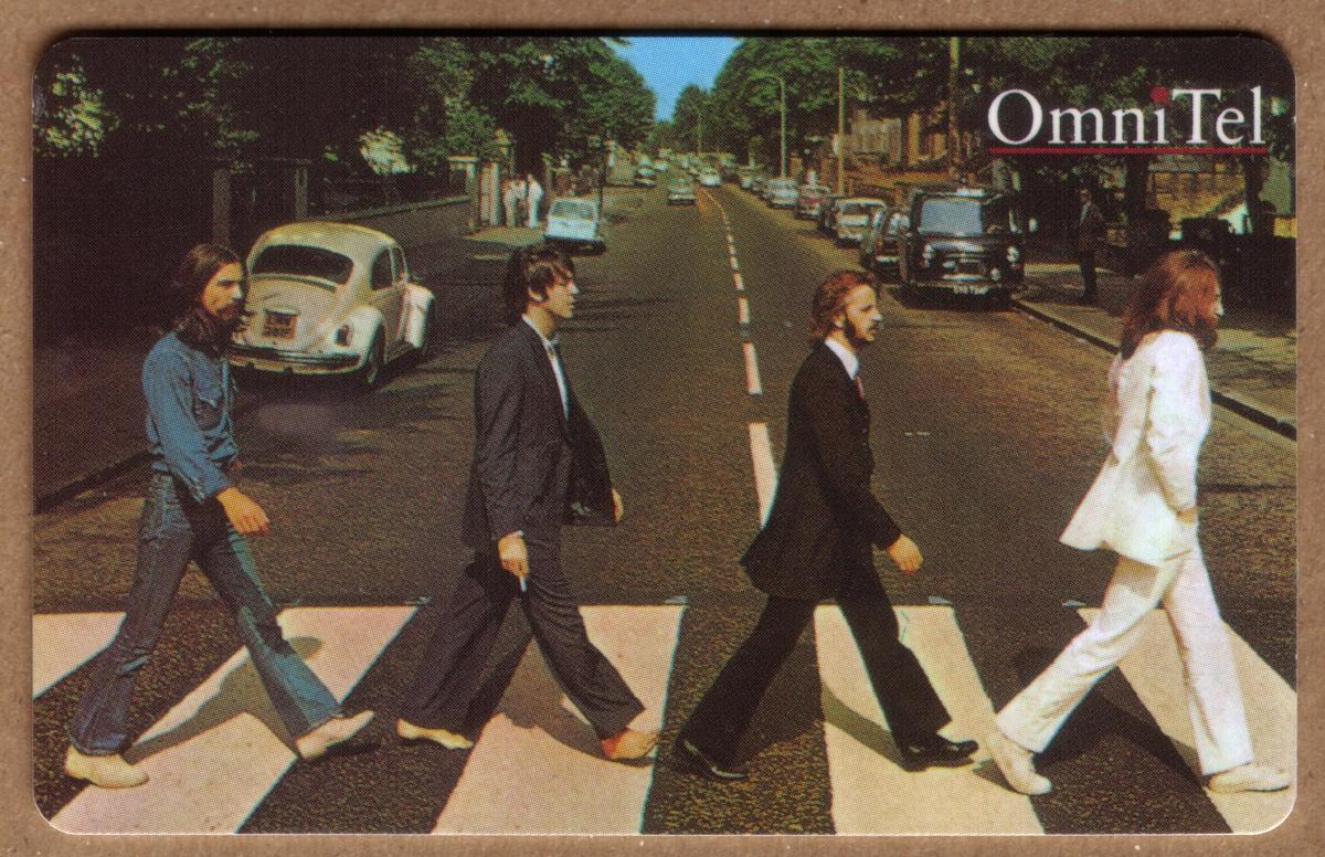 Printed by OmniTel, the card includes text referencing "Beatles Anthology Promo" and "Abbey Road Design," confirming its association with The Beatles’ anthology series. The card’s visual and textual elements connect it directly to famous music artists and bands of the 1960s, specifically showcasing one of the most recognizable album covers in music history.