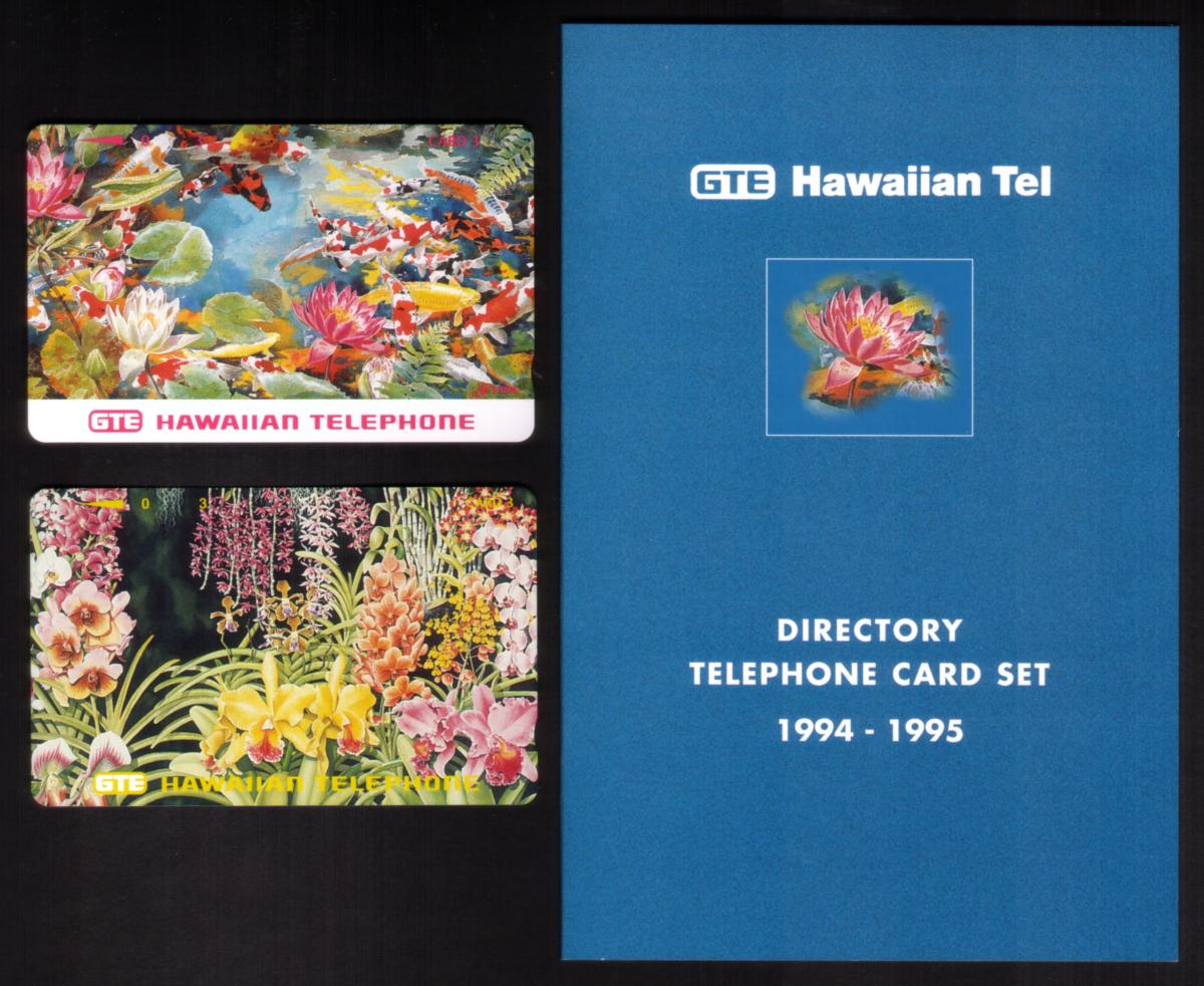 These two collectible cards from GTE Hawaiian Telephone feature vibrant and artistic imagery reflecting Hawaii's natural beauty. The first card showcases a colorful koi fishpond filled with numerous koi fish of varying colors, including combinations of orange, white, black, and yellow. Surrounding the pond are lush green lilies and aquatic plants, with blooming white and pink lotus flowers adding a delicate touch. The water’s surface captures reflections and movement, enhancing the vibrant scene of this serene garden setting. The text "GTE HAWAIIAN TELEPHONE" is printed at the bottom in bold red letters, with a small "CARD 3" in red at the top right corner.