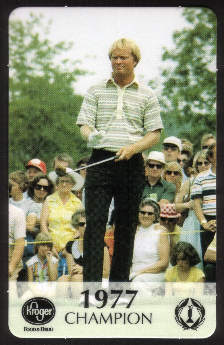 Set of four Jack Nicklaus golf cards from 1977 to 1993, showcasing tournament moments, achievements, and Kroger promotion details, celebrating a golf legend. |