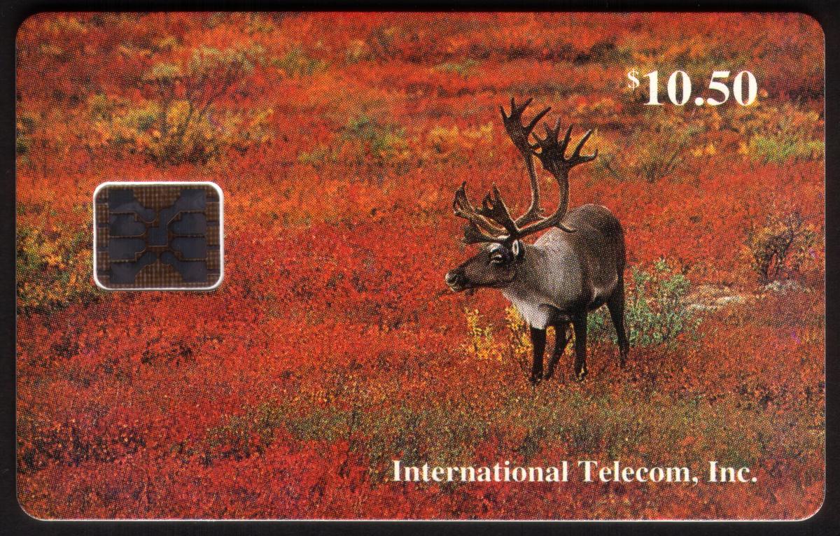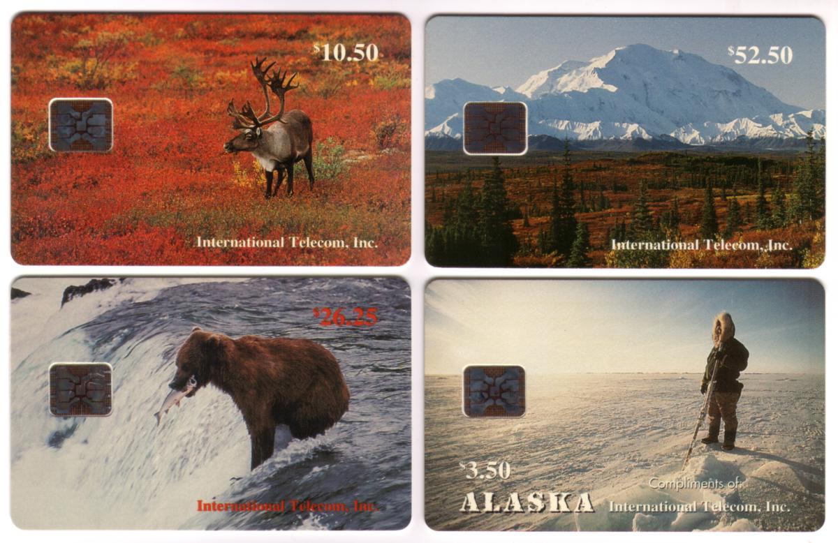This set of four collectible chip cards from International Telecom, Inc. features striking scenes of Alaska’s natural beauty and wildlife. The $3.50 chip card shows an Eskimo dressed in traditional winter clothing standing on a vast, snow-covered frozen landscape under a clear sky. The figure holds a long tool or spear, emphasizing the harsh, icy environment.