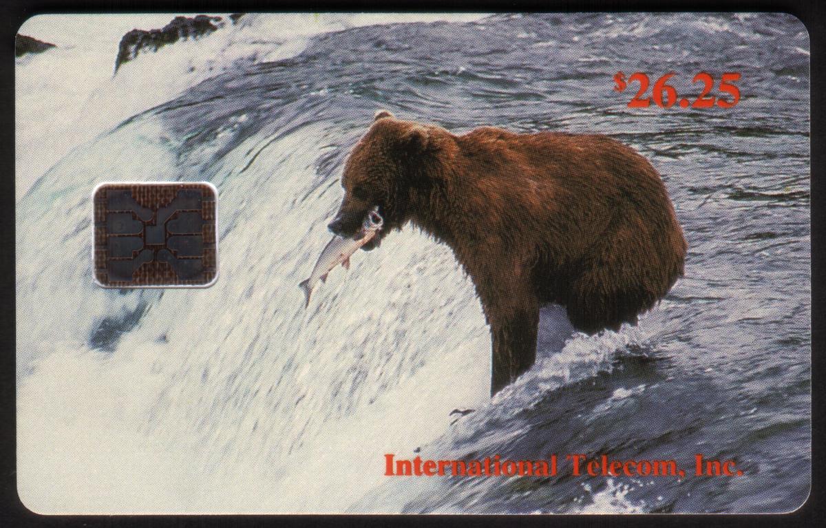 The $26.25 chip card captures a brown bear in mid-action by a rushing waterfall. The bear holds a salmon firmly in its mouth while standing in the flowing water, highlighting a dynamic moment of wildlife activity in Alaska.