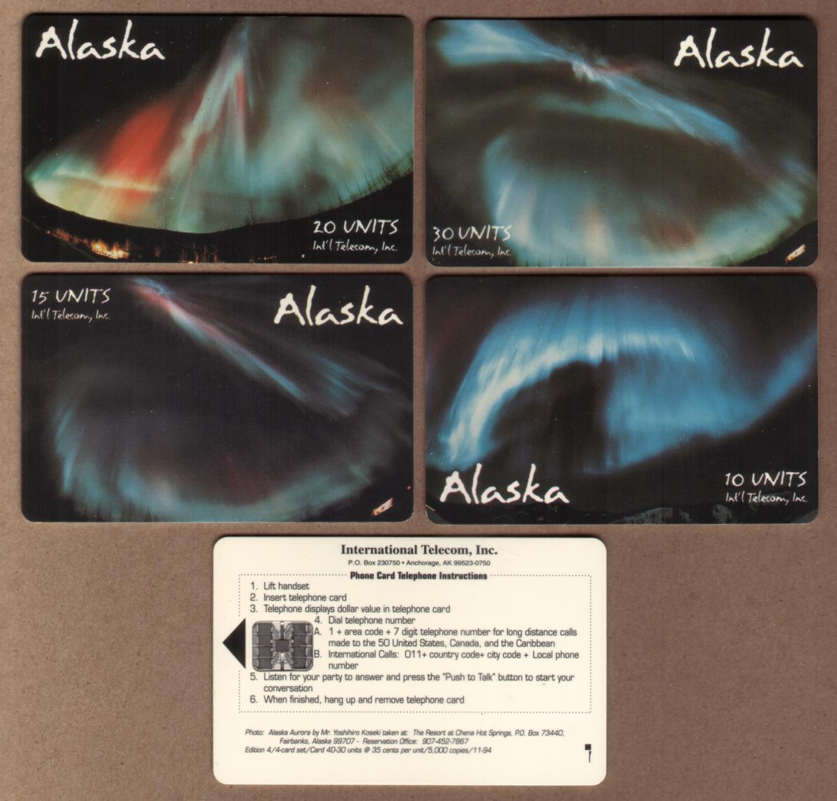 Set of four Alaska Aurora Borealis phone cards with stunning scenic photos, vibrant colors, and denominations of 10, 15, 20, and 30 units, showcasing Northern Lights. |