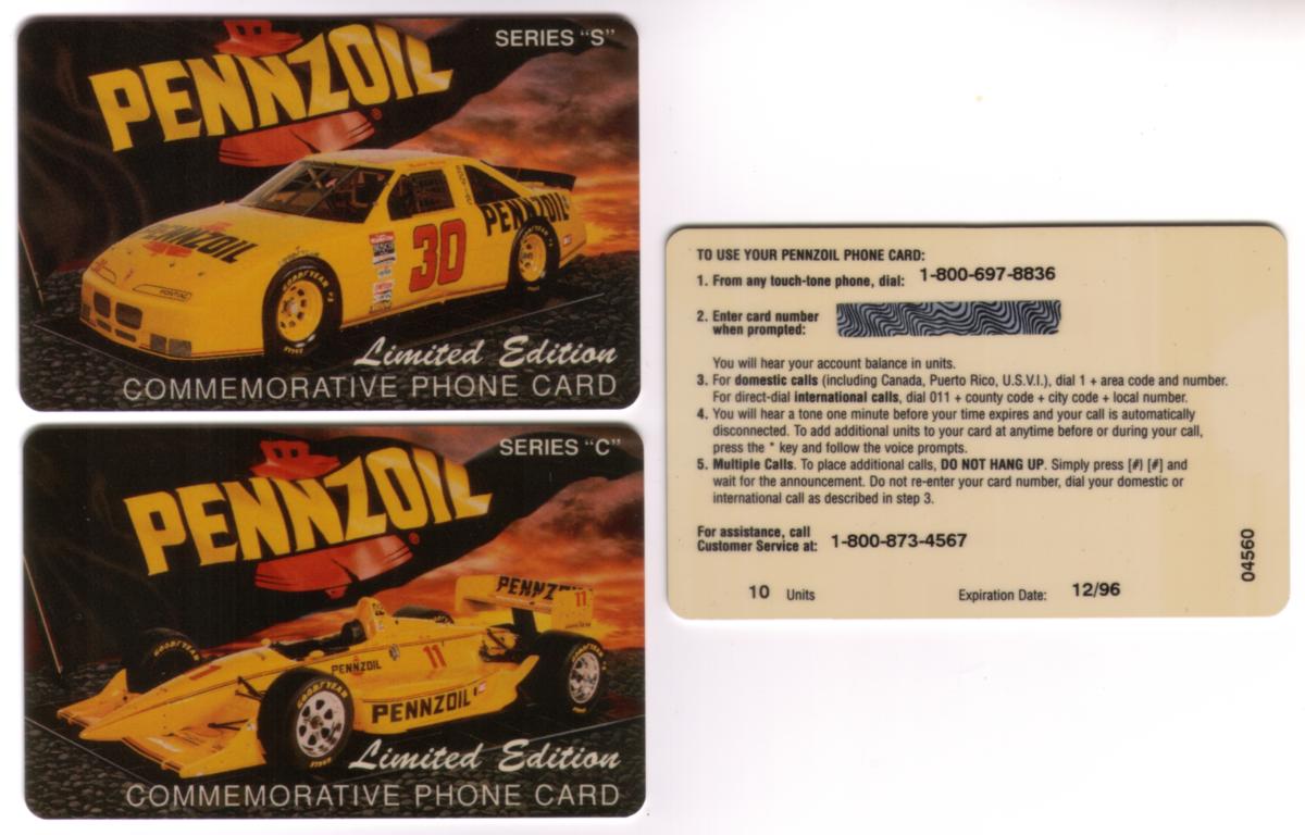 This set features two collectible chip cards and a matching folder centered on auto racing and the Pennzoil brand. Both cards prominently display the Pennzoil logo along with familiar corporate trademarks associated with the racing industry. The folder also includes the Pennzoil logo and branding, emphasizing its connection to the Series "C" & "S" Racing promotion.