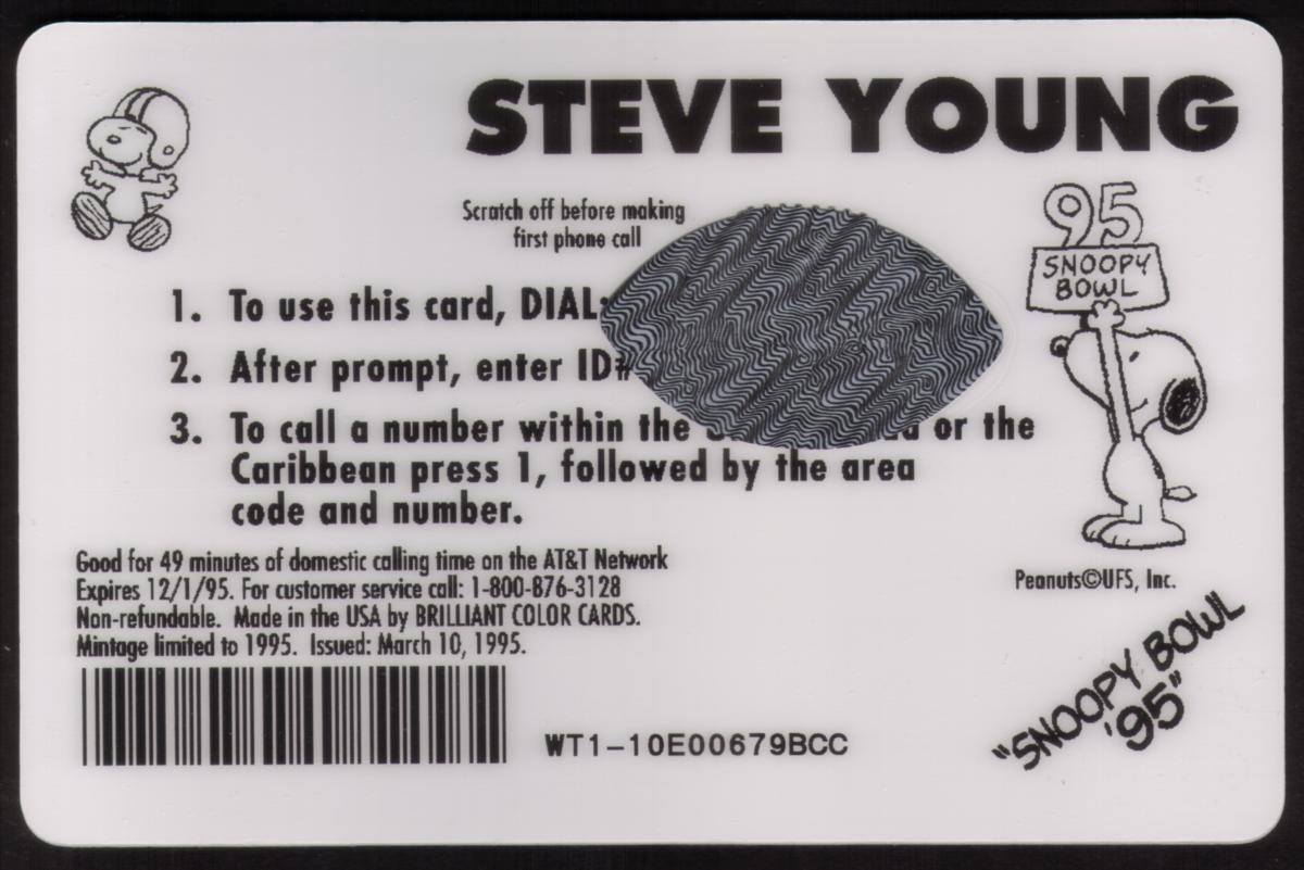 In the lower left corner, the AT&T logo is printed in black. The card’s overall design combines elements from football, Peanuts cartoons, and animation, creating a colorful and vibrant collectible honoring both Steve Young and the Snoopy Bowl event from 1995.