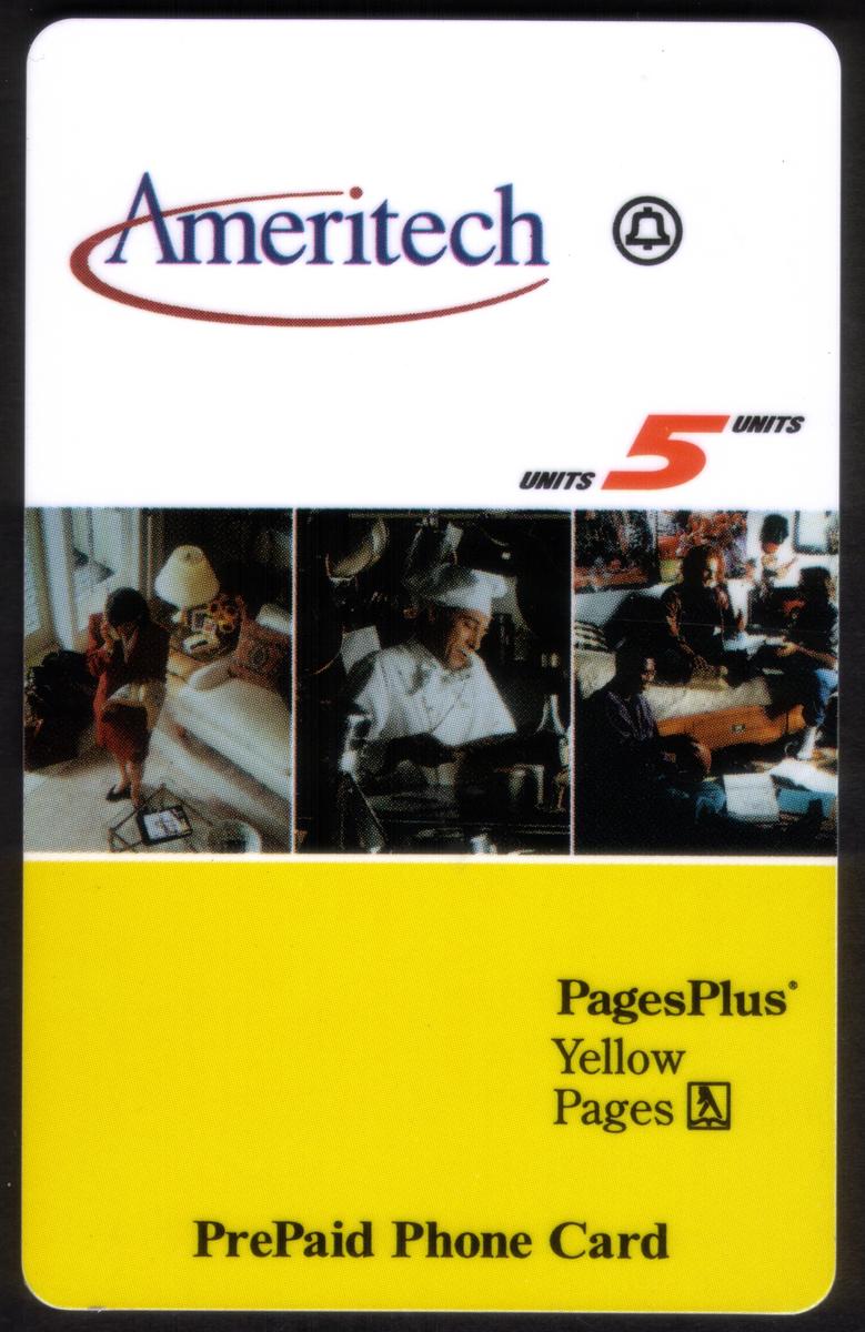 This Ameritech prepaid phone card features a design split into two sections. The top half is white with the Ameritech logo prominently displayed in blue and red at the top center. To the right of the logo, there is a small black icon resembling a stylized bell. Below the logo, the card indicates the value "5 UNITS" with the number 5 in large red font and "UNITS" in black font above and below the number.