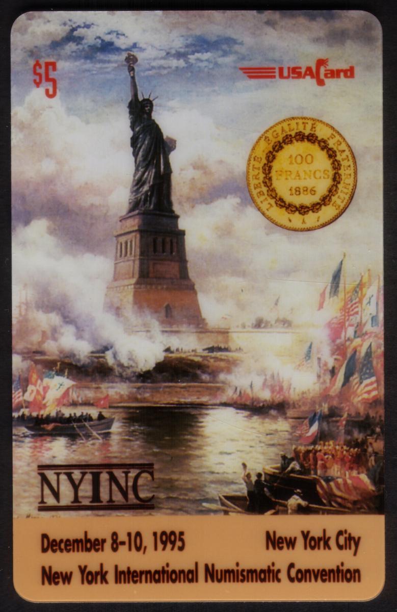 Overall, this card blends iconic American symbols with numismatic elements to celebrate the 1995 New York International Numismatic Convention, emphasizing heritage, currency, and the importance of coin collecting events.