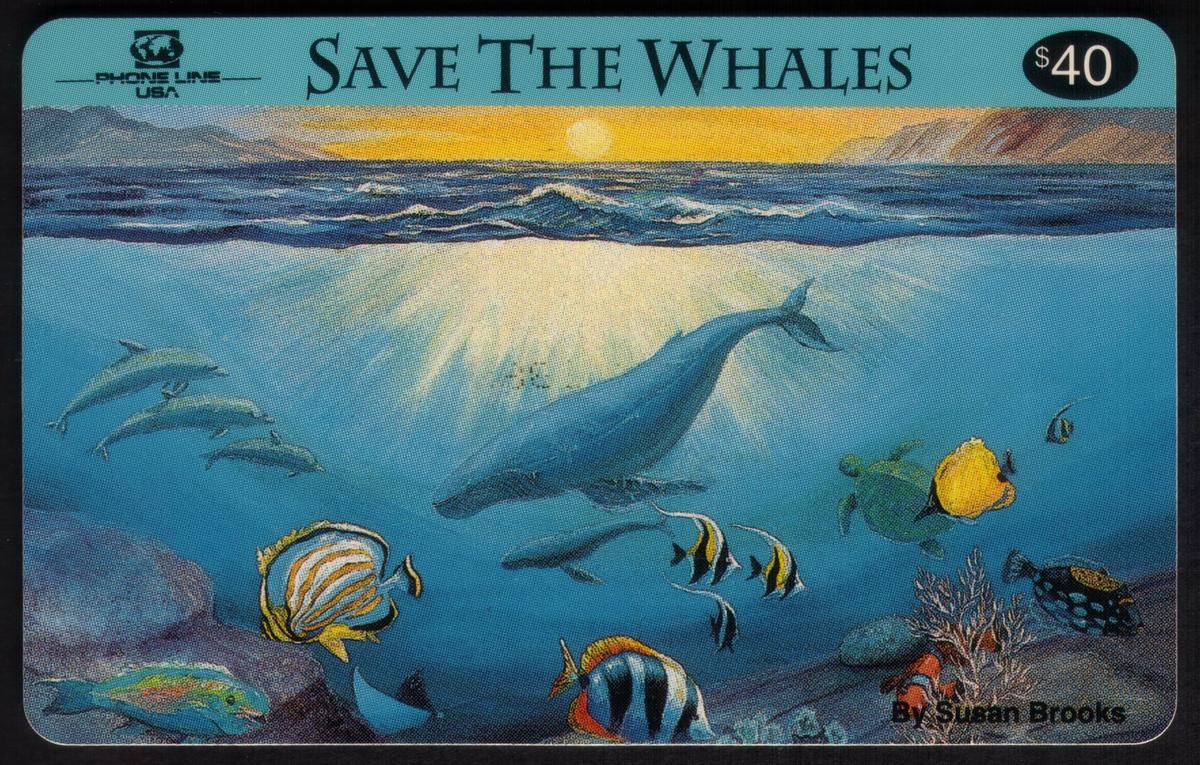 The top of the card displays the text "SAVE THE WHALES" in bold black letters, along with the denomination "$40" in a black circle on the right side. The Phone Line USA logo appears in the upper left corner. The overall composition highlights the beauty of aquatic animals and marine mammals, emphasizing the theme of wildlife conservation and endangered species protection.