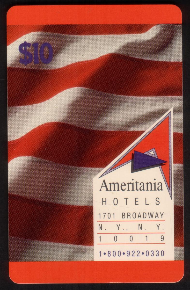 The card also incorporates a flag motif and logo design elements, reflecting the corporate promotional nature of the piece. The overall design highlights Ameritania Hotels’ branding while connecting it to travel and lodging services. The phone card’s text indicates a value of $10, suggesting its use as a prepaid calling card during its circulation.