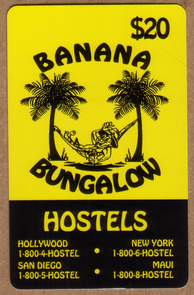 This vintage-style card showcases Banana Bungalow Hostels in Hollywood, New York, San Diego, and Maui, with a $20 value and travel industry logos. |