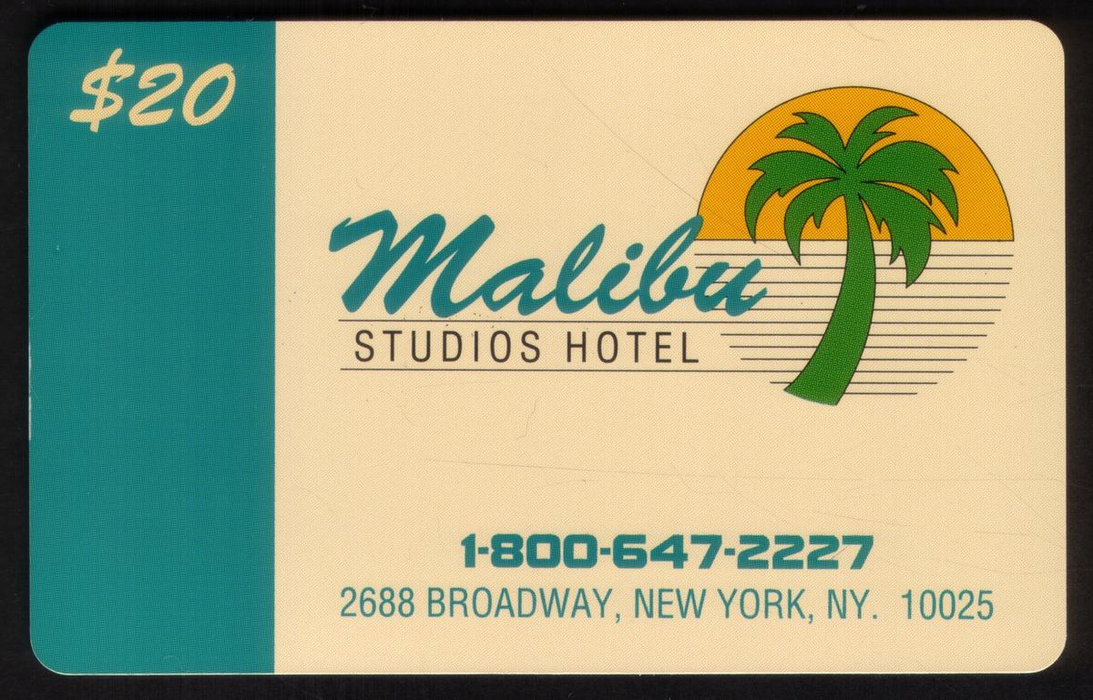 This collectible card features the Malibu Studios Hotel located in New York. The design prominently includes the hotel's logo, which depicts a green palm tree set against a yellow semi-circle resembling a setting or rising sun, with horizontal lines extending rightward from the circle. The card value of $20 is displayed in the upper left corner in a white font on a solid teal vertical band that spans the height of the card's left side.