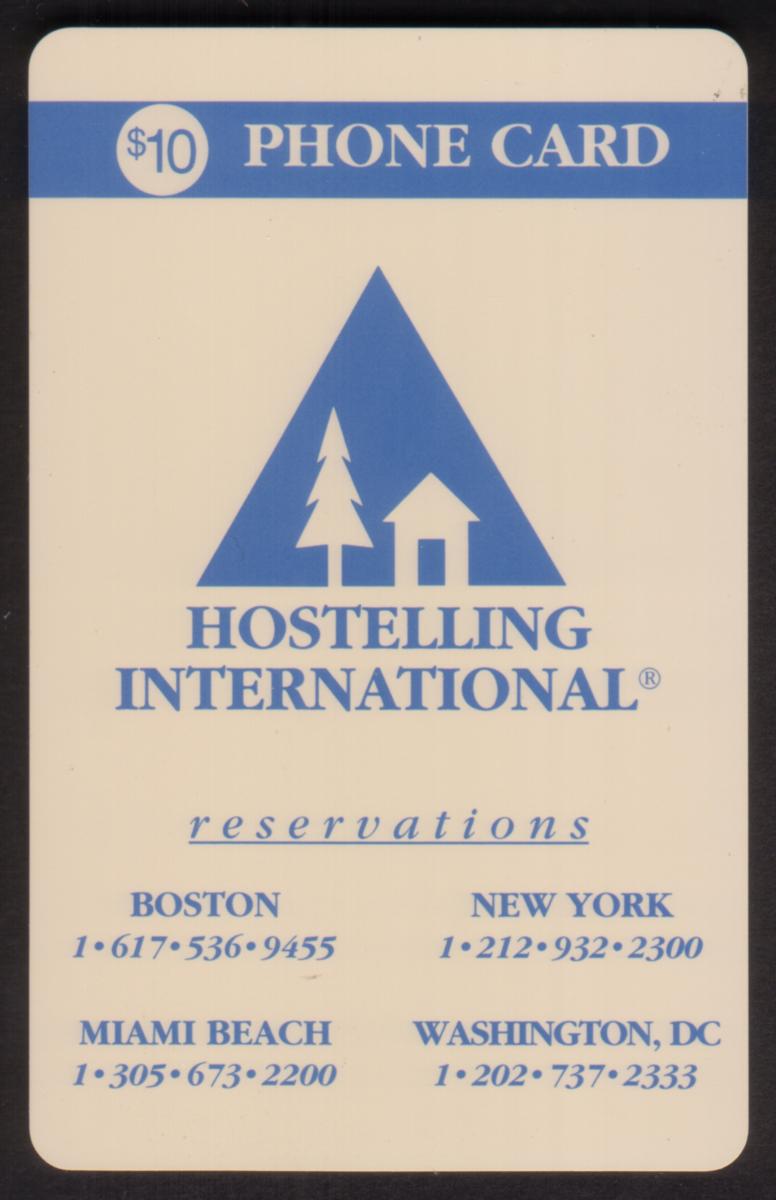 Hostelling International $10 prepaid card featuring logo, city contacts, and reservation info, reflecting early travel telecommunications and branding. |