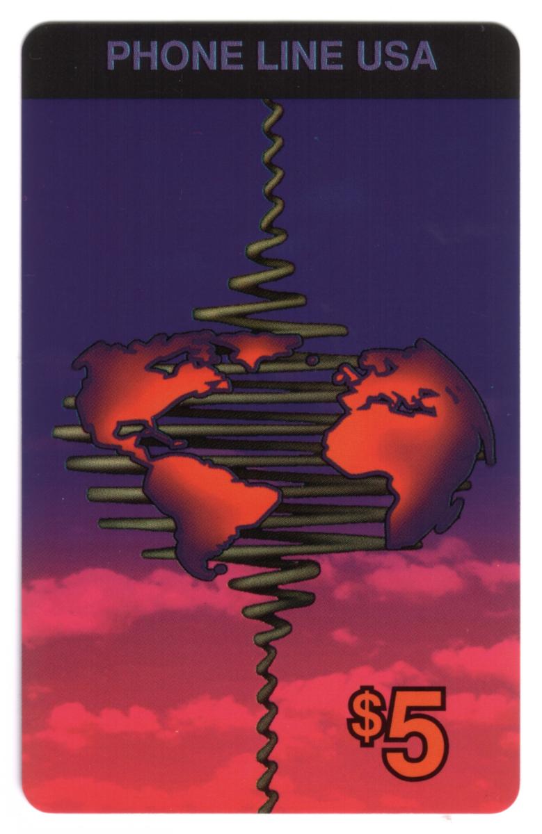 At the top of the card, the words "PHONE LINE USA" are printed in light purple, contrasting with the dark background. The card's value, "$5," is prominently displayed in bold orange and black on the lower right corner. The artwork effectively symbolizes global communication and connectivity.