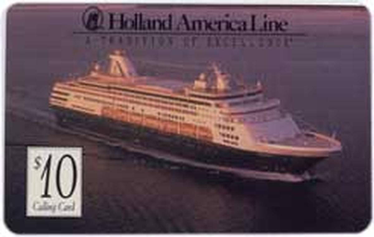 This collectible phone card features a photographic image of the Holland America Line cruise ship. The ship is depicted sailing on calm waters, clearly showing its white hull and multiple decks. The sky above is bright and clear, suggesting pleasant weather conditions during the voyage. The ship’s design showcases large windows and lifeboats along the side, elements typical of passenger cruise liners.