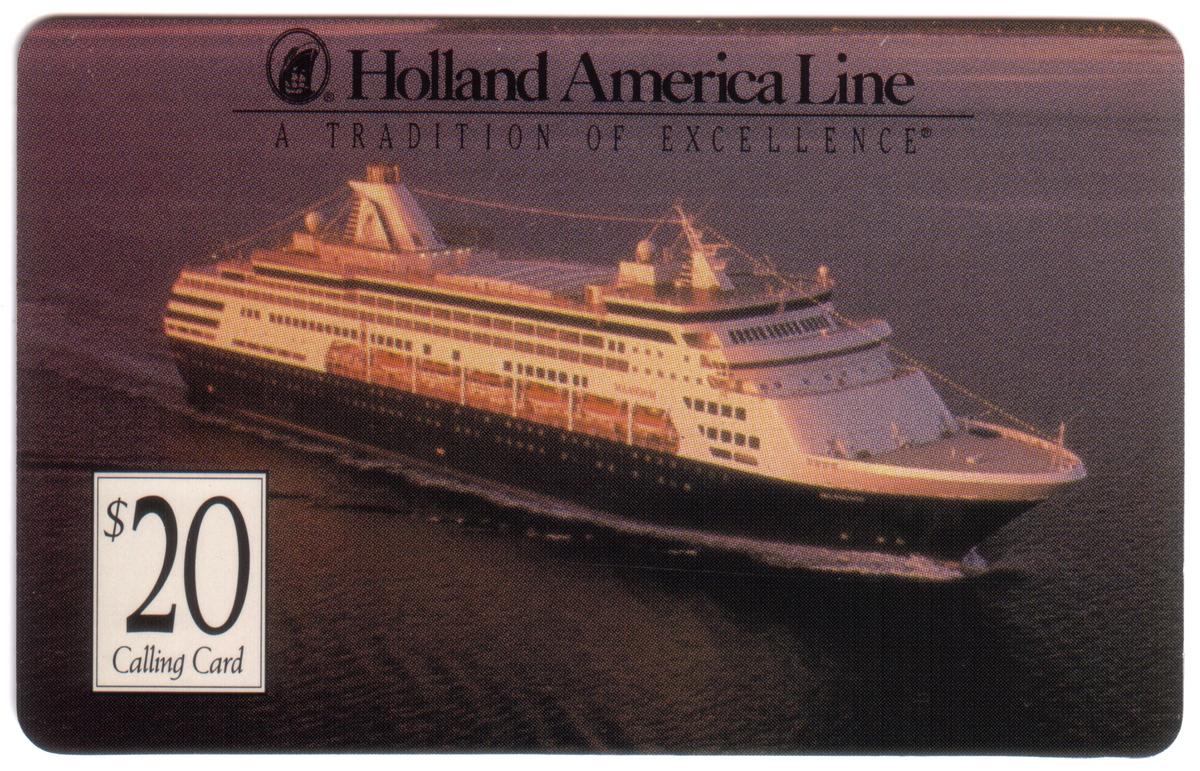 This phone card is designed for use in communication, linked specifically to Holland America Line and reflects themes of sightseeing, travel, transportation, cruises, and vacations. The card is issued through Phone Line USA.