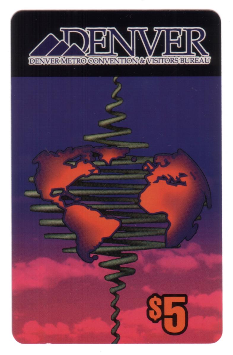 At the top of the card, in a black horizontal band, the white text "DENVER" is prominently displayed, accompanied by the full name "Denver Metro Convention & Visitors Bureau" underneath it. This indicates the card's association with the Denver Visitors Bureau. The card’s value is clearly marked at the bottom right corner with "$5" in large, bold orange numbers outlined in black.