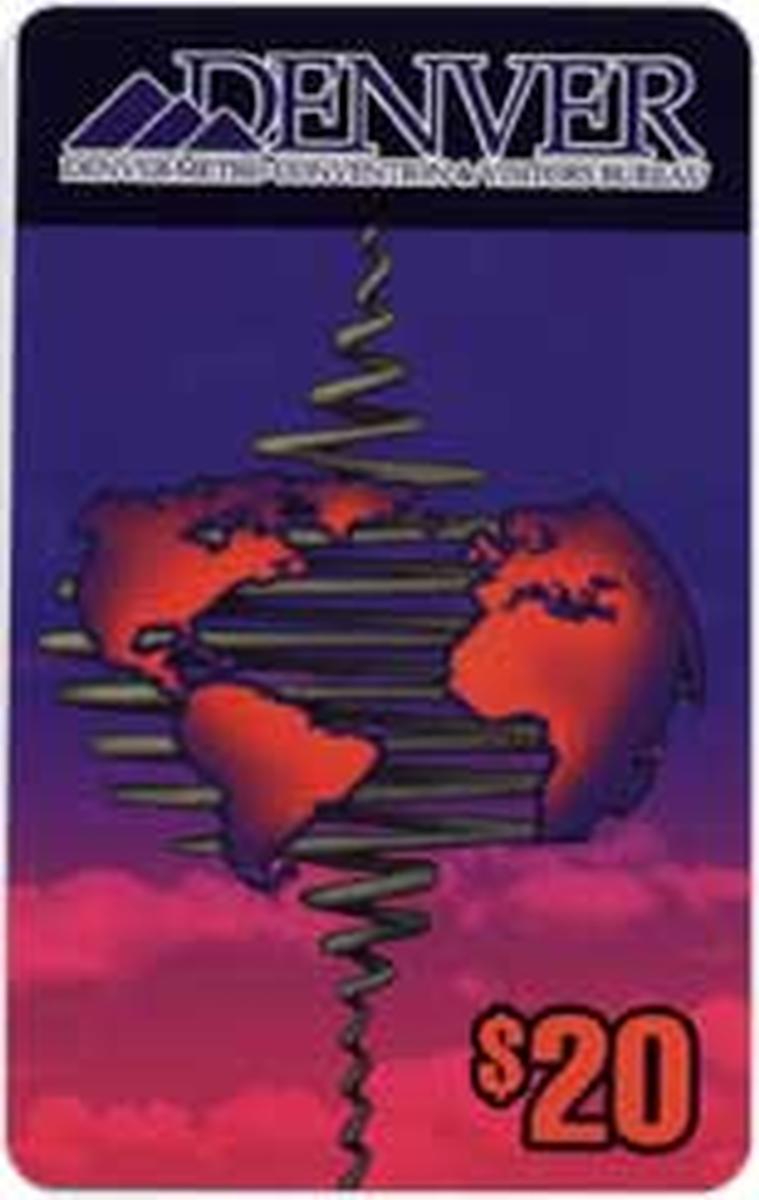 At the top of the card, the text "Connecting The World" appears prominently in uppercase, with "Denver Visitors Bureau" displayed beneath it. The USA phone line is indicated, and the word "WorldCom" is printed near the top left in white font on a blue background. The number "20" is displayed in bold in the upper right corner, signifying the card’s value. The overall design combines elements of travel, communication, and global unity, presented in an artistic and colorful manner.