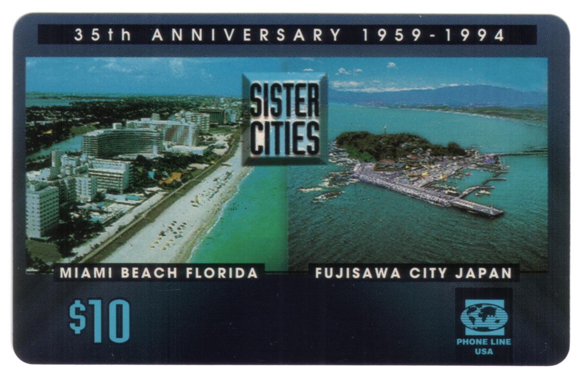 The card’s design incorporates both English and Japanese elements, reflecting the unique connection between these two cities known for their beaches, waterways, and vibrant urban life. The use of bright blue and green colors represents the ocean and natural environments typical of both Miami Beach and Fujisawa. This phone card serves as a commemorative item celebrating the bond between these two diverse and dynamic cities.