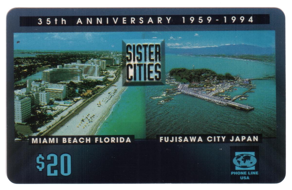 Centered between the two images is a vertical metallic emblem reading "SISTER CITIES," symbolizing the international partnership. Along the bottom edge of the card, the locations Miami Beach Florida and Fujisawa City Japan are clearly labeled beneath their respective images. The card’s denomination is displayed in the lower left corner as "$20" in teal blue text. The lower right corner features a logo for "PHONE LINE USA," indicating the card’s telecommunications use.
