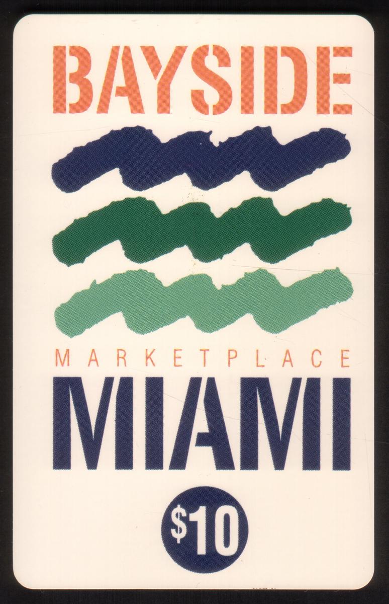 The design emphasizes a travel and artistic theme, reflecting the vibrant and popular destination that Bayside Marketplace represents. The layout integrates bold typography with colorful elements to attract collectors and users interested in iconic travel-related imagery within the United States. The card’s overall presentation focuses on the Miami location, making it an appealing piece for both phone card collectors and admirers of distinctive American landmarks.