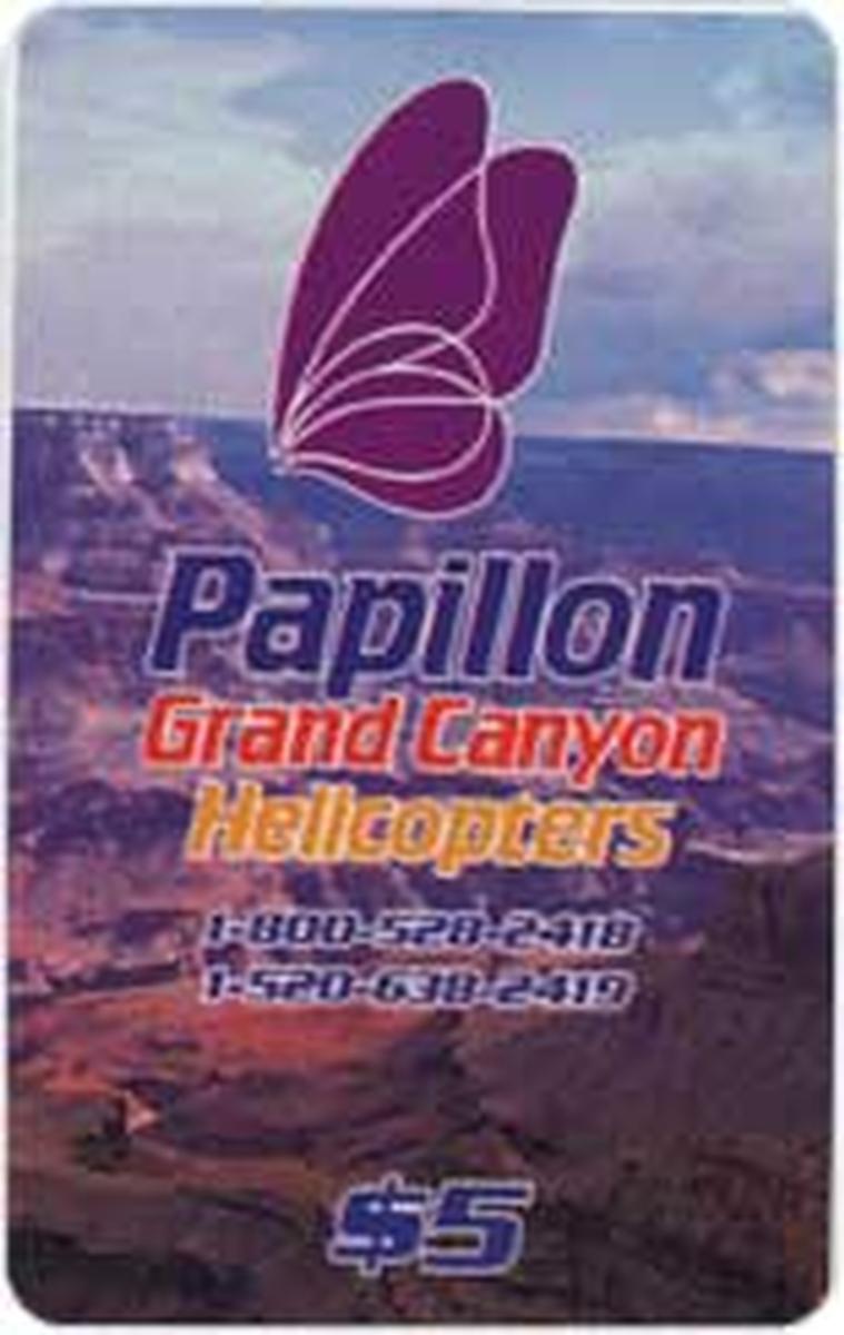 No additional logos, characters, or unrelated imagery are present. The card’s theme centers exclusively on helicopter transportation services by Papillon Helicopters over the Grand Canyon, combining both functional detail (phone card worth $5) and visual storytelling of scenic air tours.