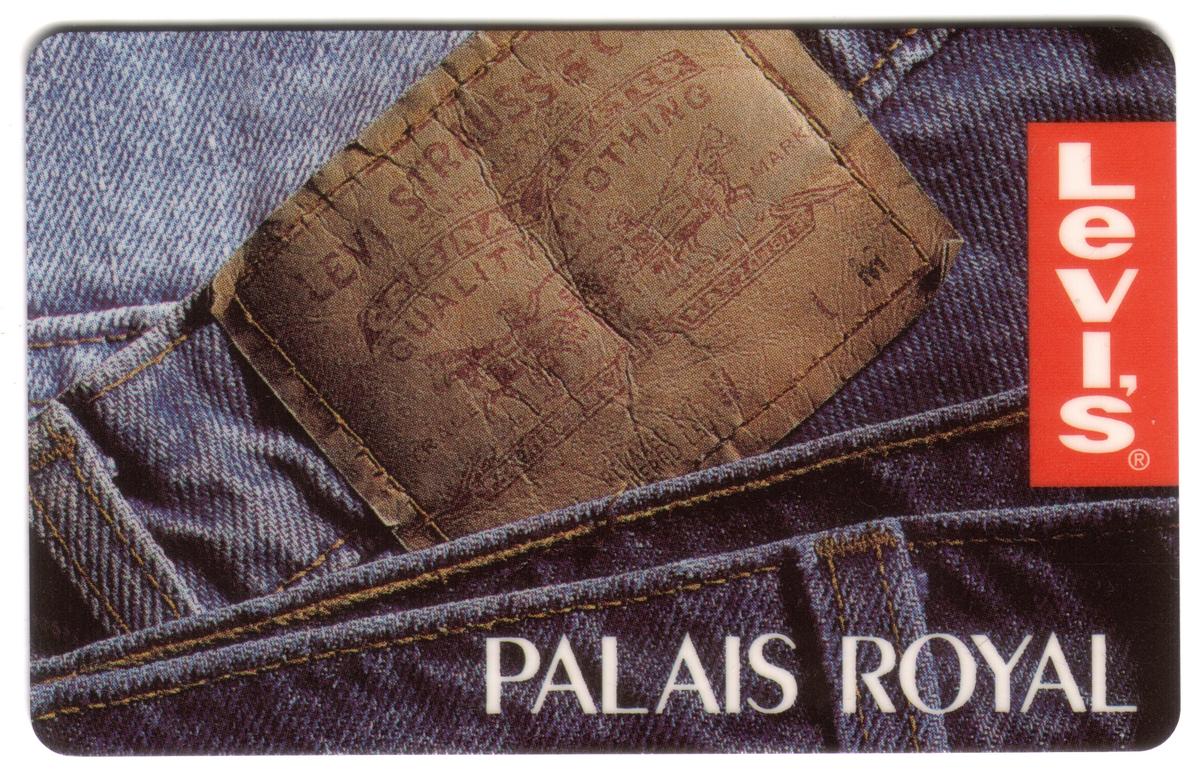 This collectible phone card features corporate logos and trademarks prominently associated with Levi Strauss & Co., specifically highlighting Levi’s blue jeans. The card includes a reference to "15m Levi Jeans (Palais Royal Department Store)," indicating an association with this retail location. The card’s design combines brand imagery and advertising elements tied to the Levi’s name. The presence of the Palais Royal Department Store name connects the card to this specific French retail institution.