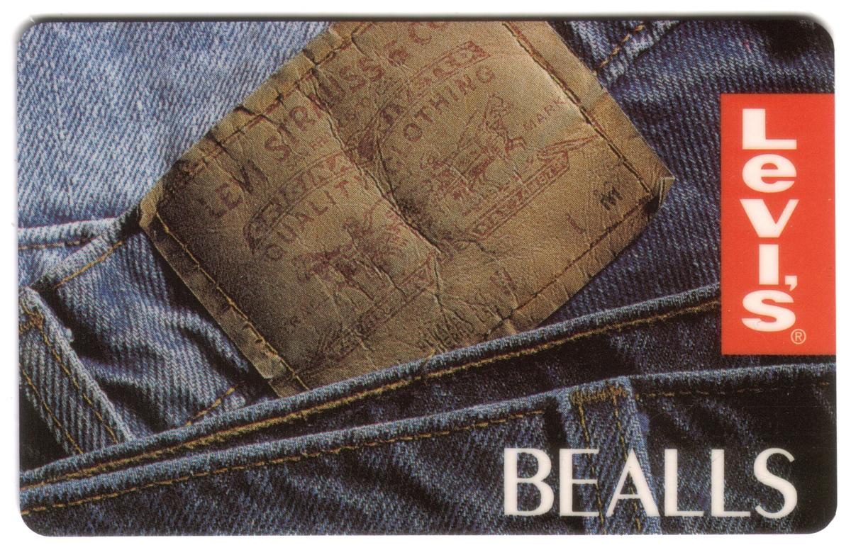 Each card includes the Levi’s logo in white text against a red square background positioned on the right side. Below the Levi’s logo, each card displays a different retail location name in bold, white capital letters: BEALLS, STAGE, PALAIS ROYAL, and FASHION BAR. The consistent design ties the four cards together, emphasizing Levi’s brand and its association with these well-known department store names.
