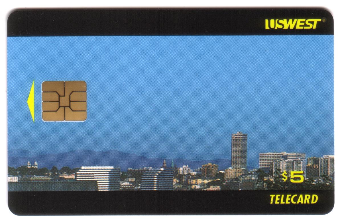 The first card has a $5 value and presents a panorama of Seattle’s downtown skyline with various mid-rise buildings in the foreground and the silhouettes of distant mountains beneath a clear blue sky. The card bears the "US WEST" logo in yellow at the top right corner, with the denomination "$5" and the word "TELECARD" in matching yellow text at the bottom right.