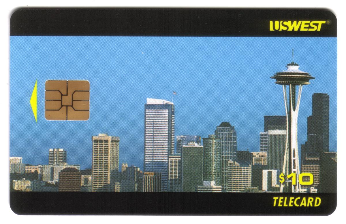 The second card displays the iconic Seattle skyline, featuring the well-known Space Needle prominently situated among several tall office buildings and skyscrapers. It has a $10 value, with the "US WEST" logo on the top right and the denomination "$10" along with "TELECARD" on the bottom right corner.