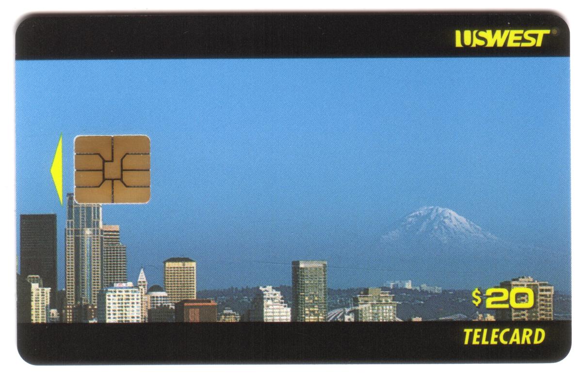 The third card, valued at $20, depicts Seattle’s cityscape with Mount Rainier visible in the background. This card highlights downtown Seattle’s high-rise buildings with Mount Rainier’s snow-capped peak rising above the horizon. The "US WEST" brand name is placed at the top right, with "$20" and "TELECARD" printed in yellow at the bottom right.