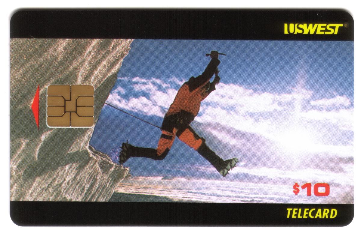 The second card has a $10 value and features a climber scaling an ice-covered cliff using an ice axe and crampons, with the climber dressed in orange, black, and yellow gear. The background shows a partly cloudy sky with scattered sunlight. The U.S. West logo appears in yellow in the upper right corner, while the $10 denomination is in red in the lower right corner above the word "TELECARD" printed in yellow.