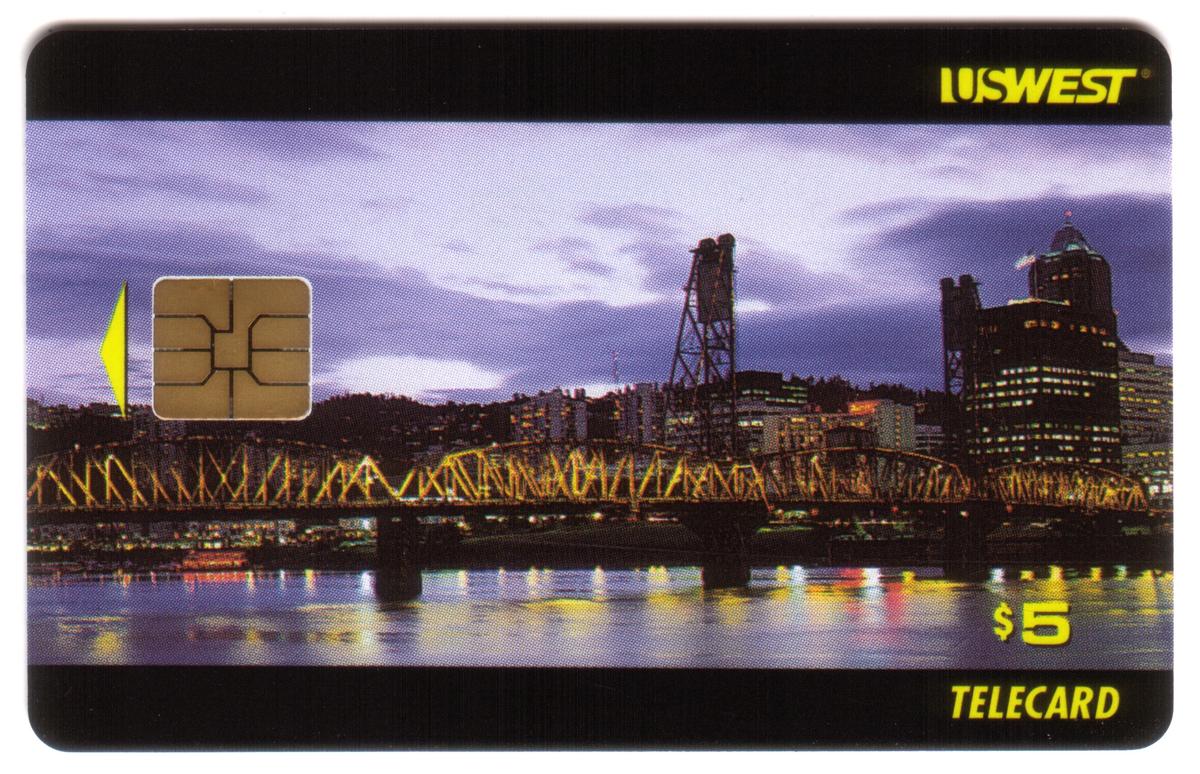 Each card includes the denomination in bright yellow on the lower right corner with the word “TELECARD” printed beneath it. The overall design emphasizes the architectural and urban elements of Portland, capturing the transition from day to night in a visually striking manner.