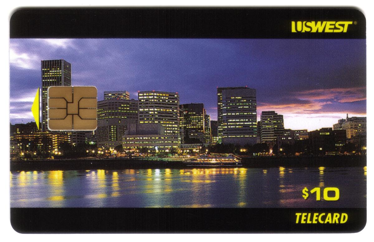 This set of three collectible phone cards features scenic nighttime views from Portland, Oregon. Each card is branded with the “US WEST” name in the top right corner and has a chip in the left center area for use. The cards are part of the Skyline Series Puzzle Set of 3 (#6), capturing iconic architectural and cityscape images of Portland along its waterfront.
