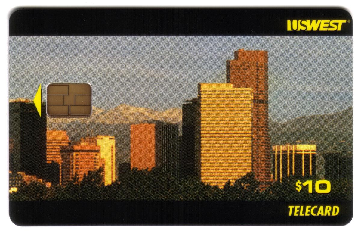 This set of three collectible U.S. West Telecards features photographic views of the Denver, Colorado skyline with scenic mountain backgrounds. Each card displays a different perspective of the city’s distinct architecture framed by natural elements such as tree lines and mountain ranges visible in the distance. The lighting on the buildings suggests the images were taken during golden hour, casting a warm glow on the high-rise structures.