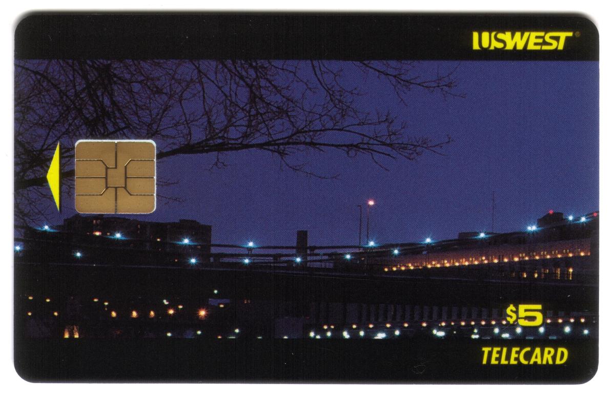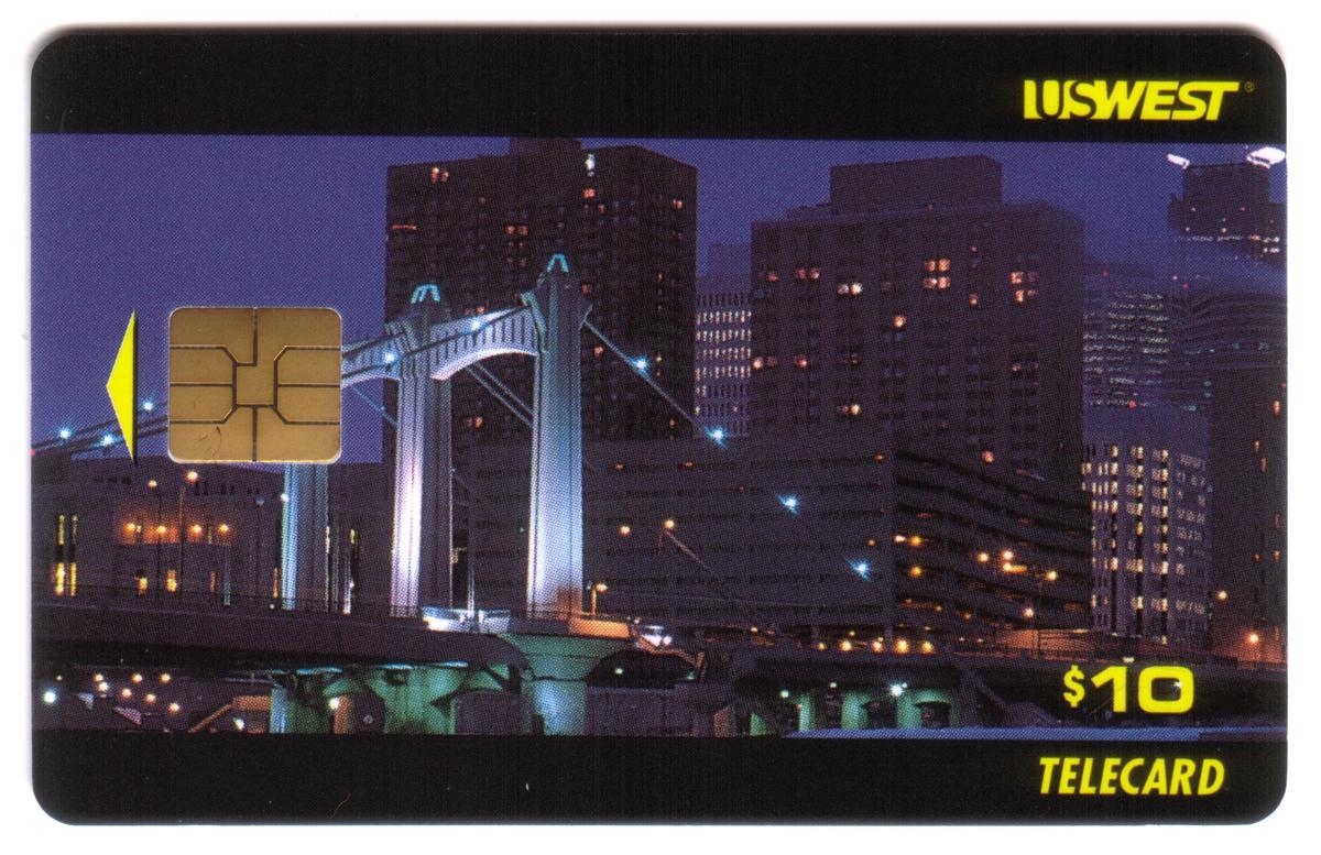 The $10 Telecard highlights a distinctive bridge in Minneapolis, lit up with white and turquoise lights, standing in front of tall, dark office buildings. City lights from windows and street lamps create a vibrant urban atmosphere under a deep blue night sky. The US West logo is positioned in the upper right corner, with the chip on the left side.
