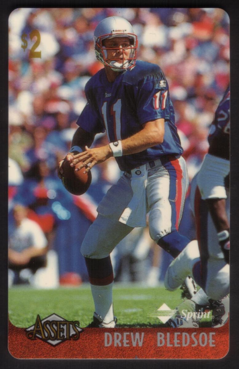 Football is represented by cards including Drew Bledsoe preparing to throw in a blue New England Patriots jersey numbered 11, Troy Aikman holding the ball in a white Dallas Cowboys jersey numbered 8, Kerry Collins running with the ball in a white Carolina Panthers uniform numbered 12, Isaac Bruce carrying the ball in a Los Angeles Rams blue and yellow numbered 80 jersey, Marshall Faulk running with the ball in a white Indianapolis Colts jersey numbered 28, William Floyd running in red and gold San Francisco 49ers attire numbered 40, Steve McNair in the gold and white uniform of the Brigham Young University Braves preparing to throw, Steve Young looking to pass in a white and red San Francisco 49ers jersey numbered 8, and Dale Earnhardt wearing racing gear with a black and red cap branded "Dale Earnhardt."