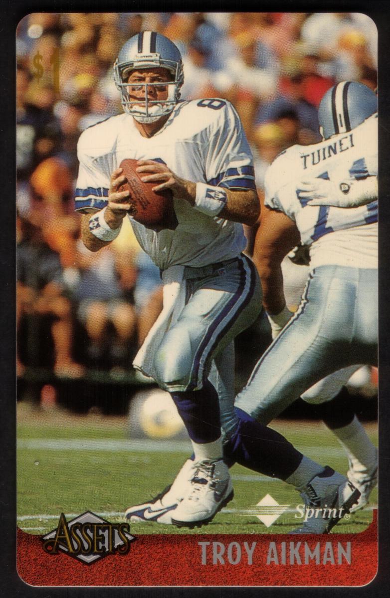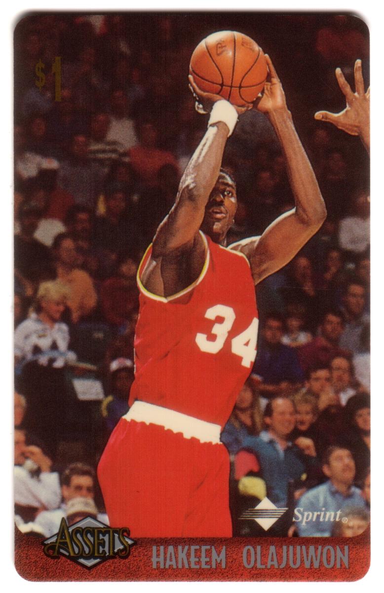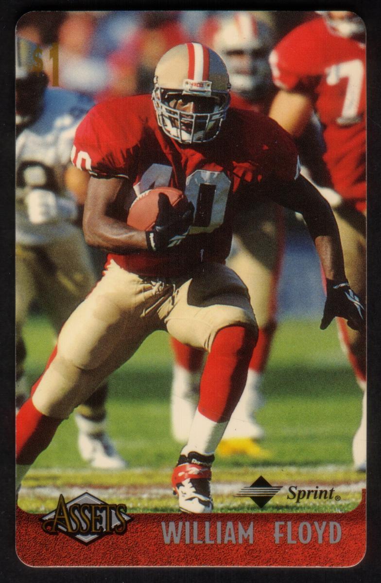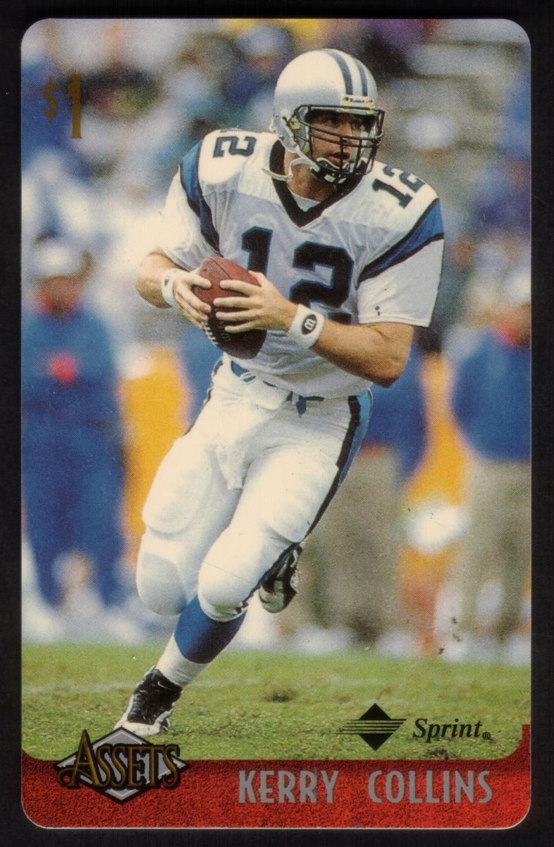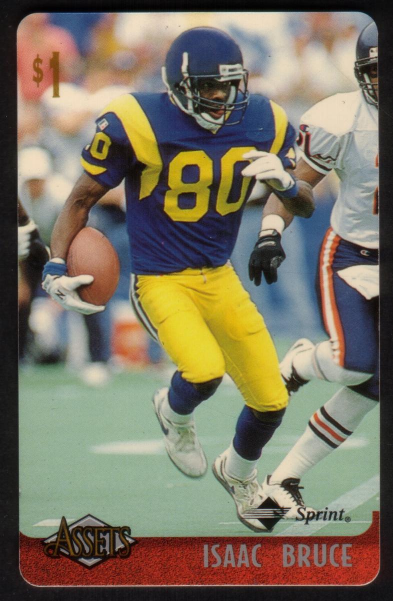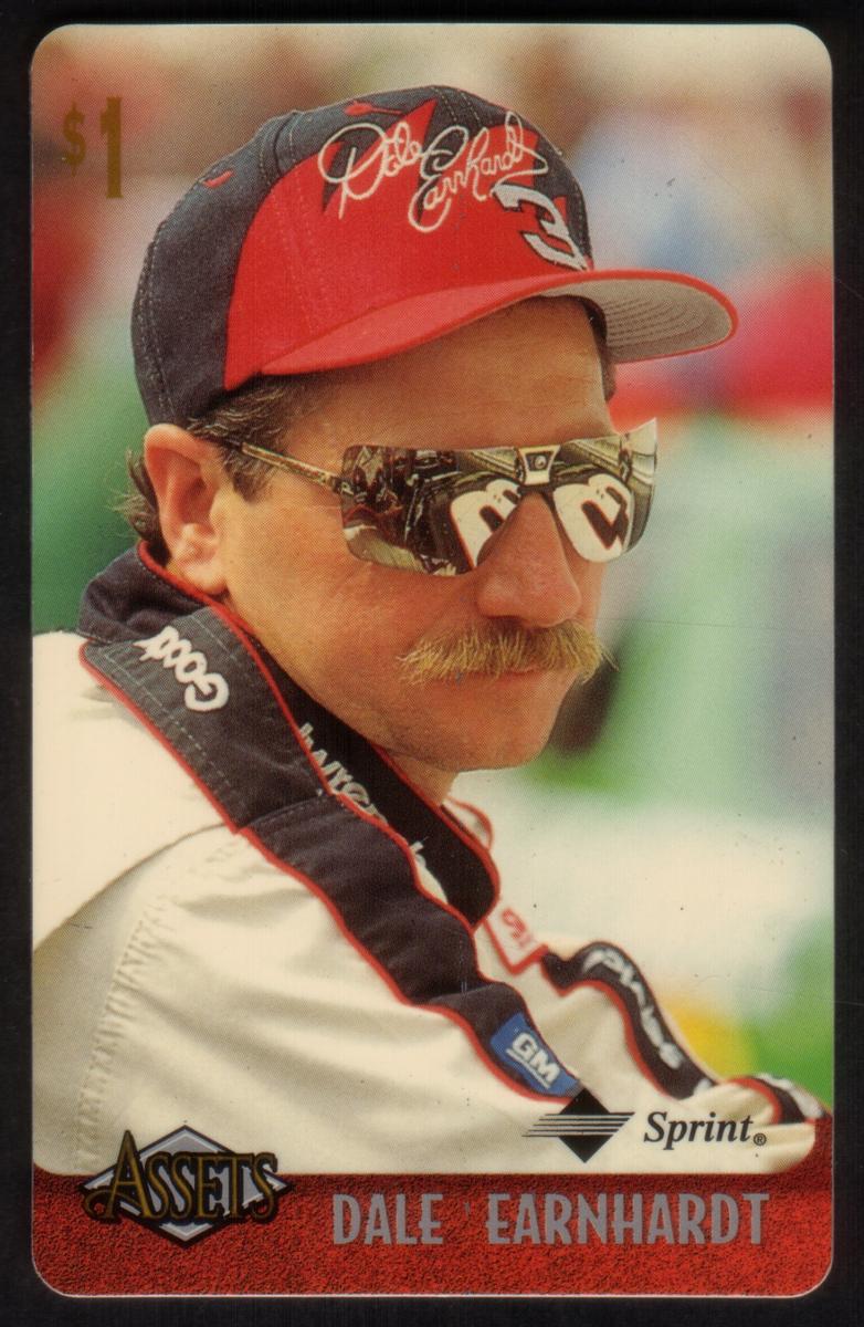 This collection features collectible phone cards from the "Assets" series issued by Sprint. Each card displays a vibrant photographic image of a prominent athlete from various sports including football, basketball, baseball, racing, and hockey. The front of each card shows the close-up action or portrait of the athlete, along with a red band at the bottom that contains the athlete’s name in bold capital letters. The "Assets" logo and the Sprint logo appear prominently on the lower left and right corners respectively. Each card has a denomination of $1, printed near the top left corner in gold.