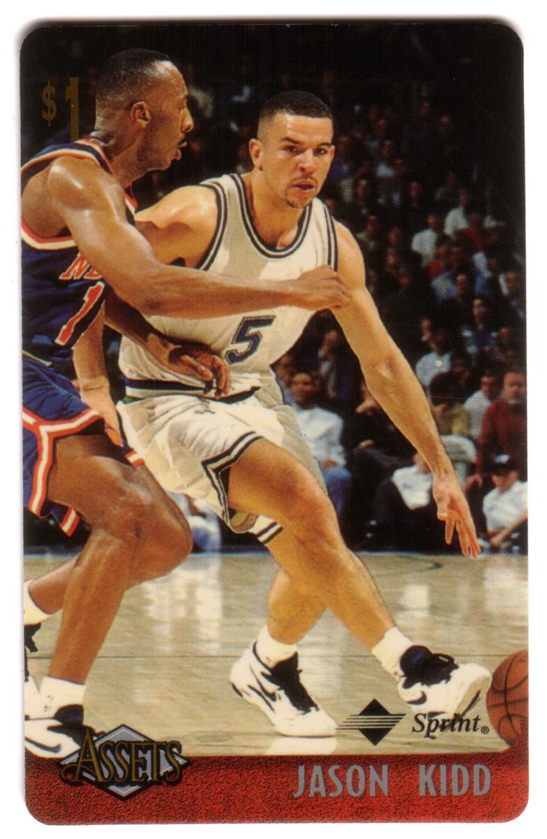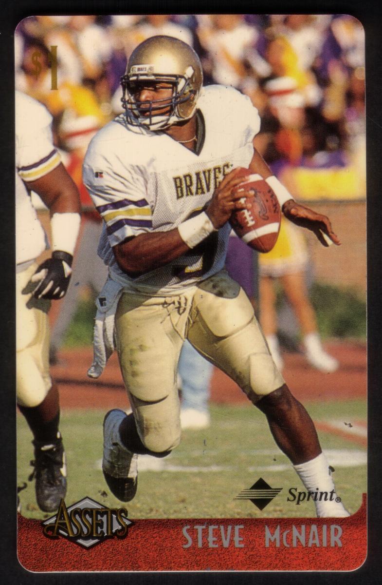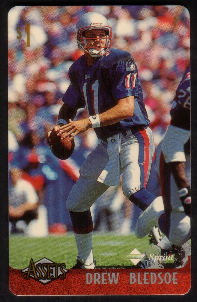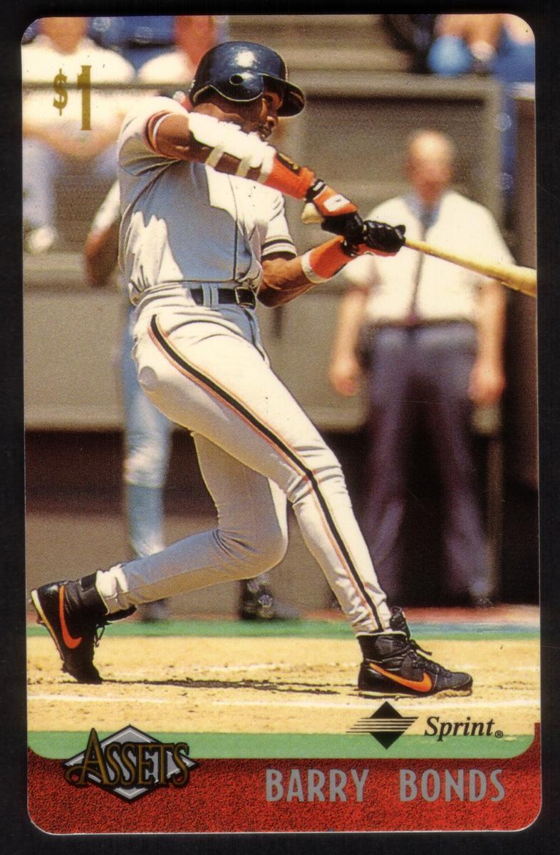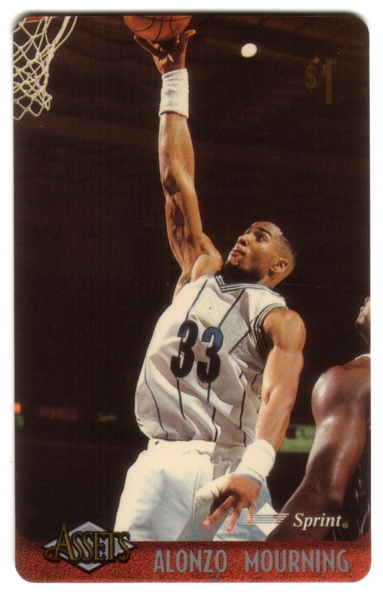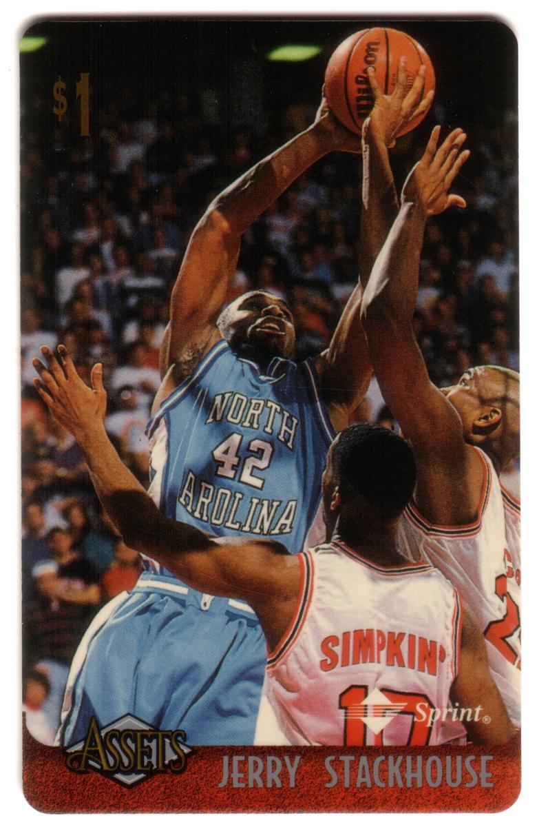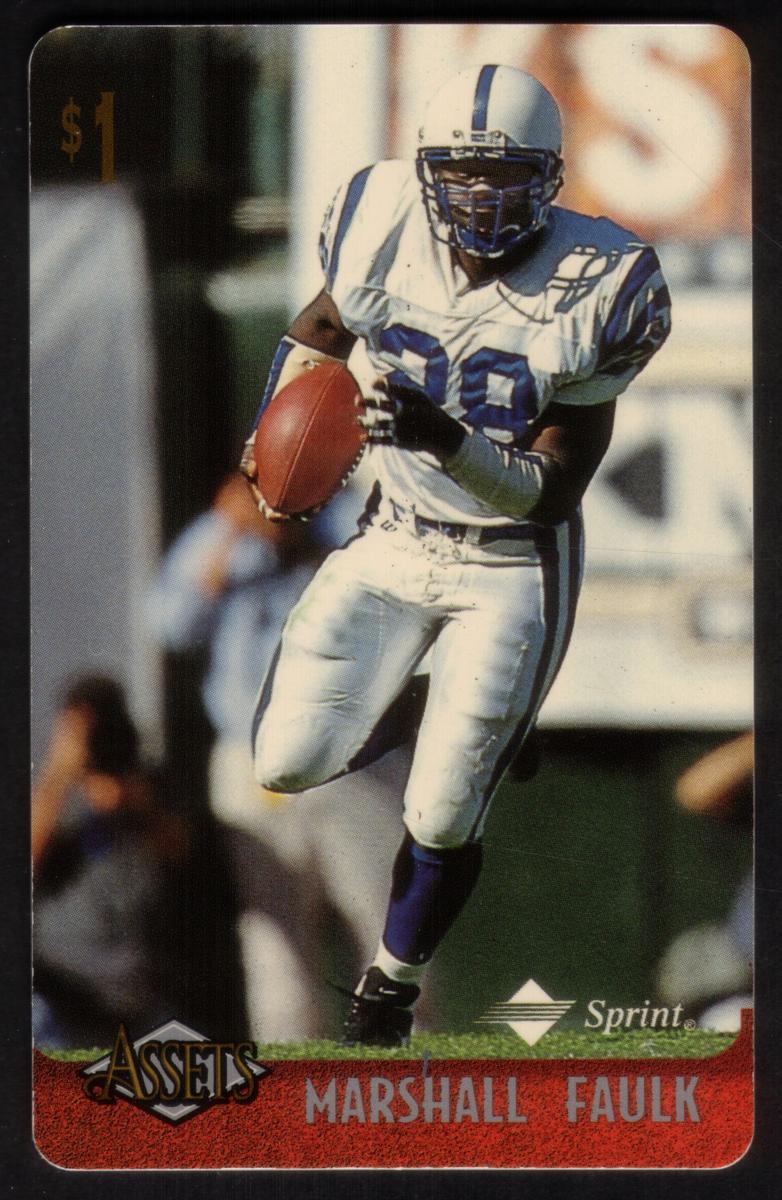 This collection features collectible phone cards from the "Assets" series issued by Sprint. Each card displays a vibrant photographic image of a prominent athlete from various sports including football, basketball, baseball, racing, and hockey. The front of each card shows the close-up action or portrait of the athlete, along with a red band at the bottom that contains the athlete’s name in bold capital letters. The "Assets" logo and the Sprint logo appear prominently on the lower left and right corners respectively. Each card has a denomination of $1, printed near the top left corner in gold.