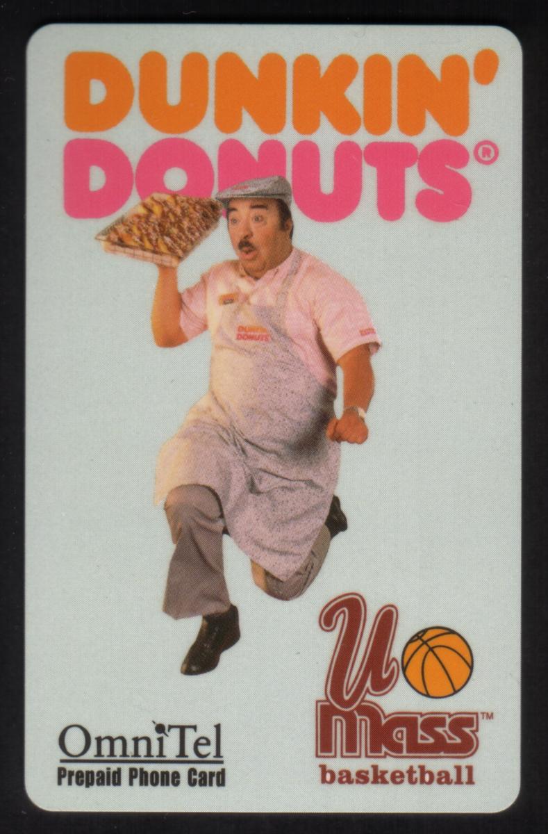 Dunkin Donuts and UMass basketball themed prepaid phone card featuring vibrant branding, a delivery worker image, and OmniTel logo for calling convenience. |