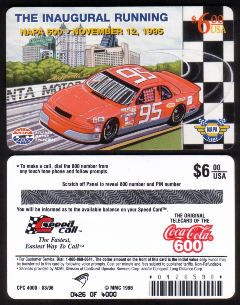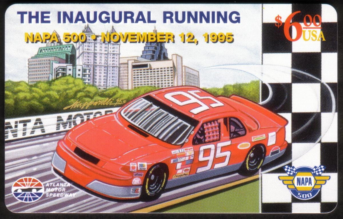 Collectible phone card featuring the 1995 NAPA 500 at Atlanta Motor Speedway, with racing imagery, sponsorship logos, and prepaid calling value. |