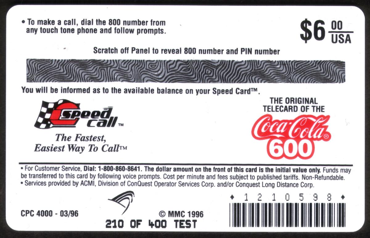 $6. NAPA 500 (Atlanta 11/12/95) Coke 600 Logo On Back TEST