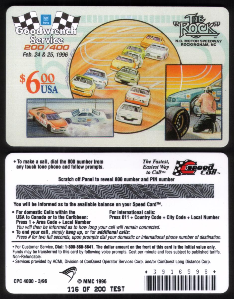 NASCAR Rockingham 1996 phone cards featuring racing artwork, GM branding, $6 value, limited edition, with usage instructions and collectible significance. |