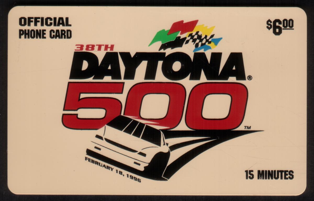 This phone card highlights key elements tied to NASCAR and the Daytona 500, making it a collectible item for fans of auto racing and motorsports history. The clean and bold graphic presentation focuses on the event’s significance without additional text or imagery.