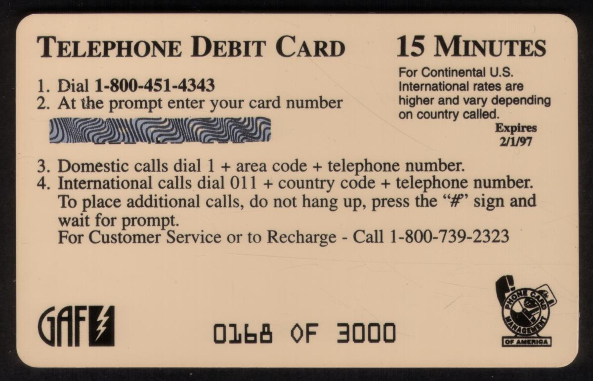 Since we have the world's largest inventory of USA phonecards for collectors, you will not necessarily receive the identical serial/batch/PIN number that we have scanned/pictured.