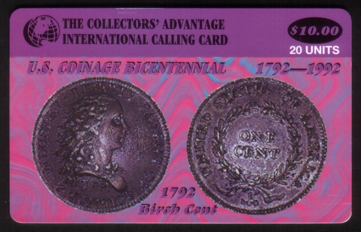 This is a collectible international calling card titled "U.S. Coinage Bicentennial 1792–1992" produced by The Collectors' Advantage. The card prominently features detailed images of the 1792 Birch Cent, one of the earliest American copper coins. On the left side is the coin’s obverse showing a profile of Liberty with flowing hair, while the right side displays the coin’s reverse with the denomination "ONE CENT" surrounded by a wreath and the date 1792 below.