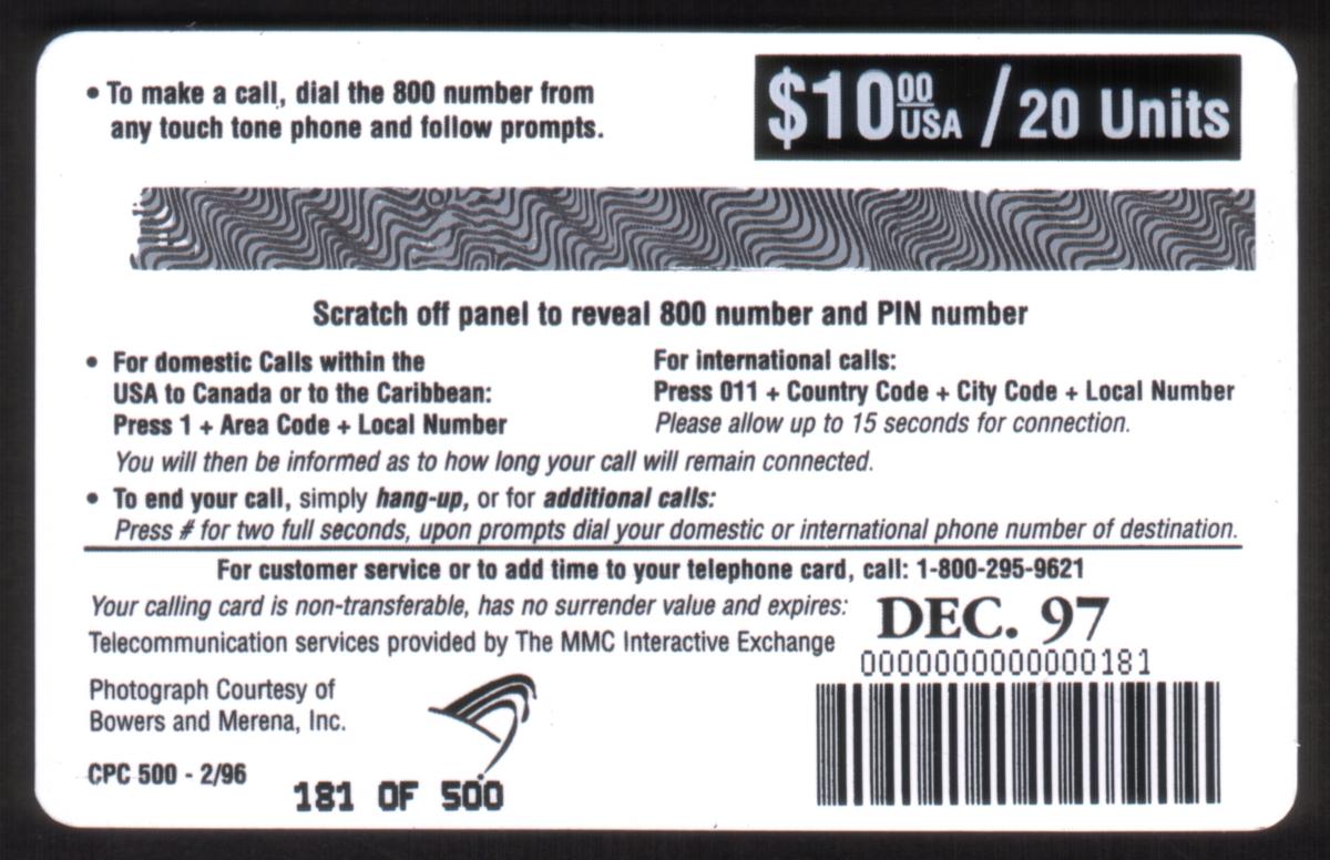Since we have the world's largest inventory of USA phonecards for collectors, you will not necessarily receive the identical serial/batch/PIN number that we have scanned/pictured.