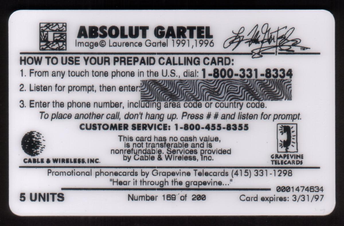 Keywords: Promotional, brand names, logos, trademarks, drinks, alcohol, foods, advertisements, advertising, artistic, designs, beverages, cable & wireless, absolute vodka, Printed Signature, Grapevine Telecards