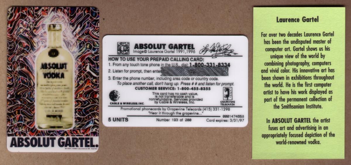 This card is part of the Cable & Wireless Grapevine Telecards collection, showcasing Absolut Vodka’s promotional collaboration with artist Lawrence M. Gartel. The design merges commercial branding with artistic innovation, typical of promotional and collectible phone cards linked to major beverage brands and artist editions.