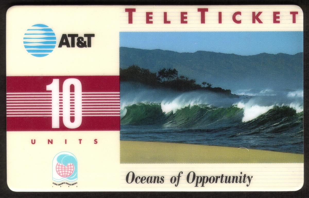 The card has "Oceans of Opportunity" printed in the upper area next to the phrase "Waimea Bay Design," emphasizing the theme related to oceans and nature. The card is issued by AT&T and identified as a Teleticket phone card, bearing the value of "10u" in the upper-left corner. The left side of the card displays the AT&T globe logo and the "TELETICKET" name, establishing the connection to AT&T’s phone card service.